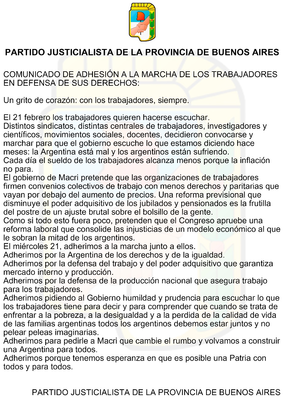 Adherimos pidiendo al Gobierno humildad y prudencia para escuchar lo que los trabajadores tiene para decir y para comprender que cuando se trata de enfrentar a la pobreza, a la desigualdad y a la perdida de la calidad de vida de las familias argentinas todos los argentinos debemos estar juntos y no pelear peleas imaginarias.